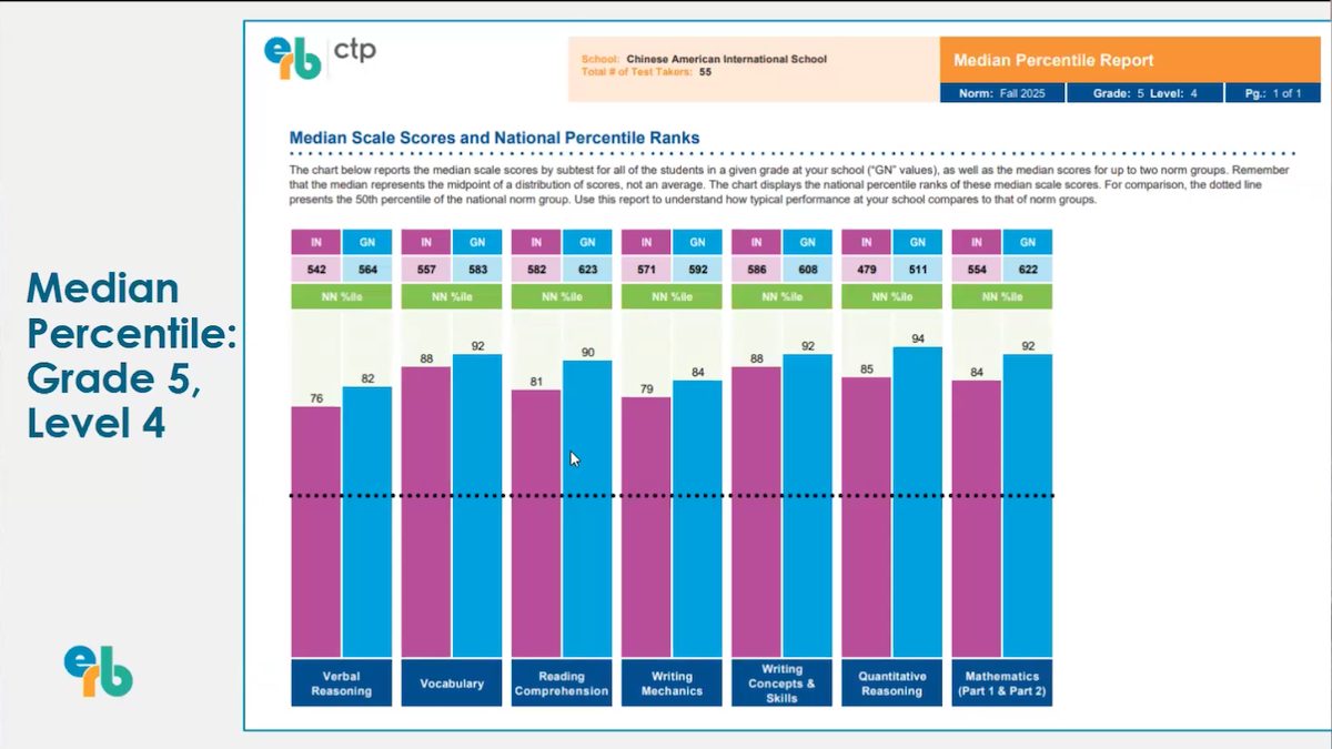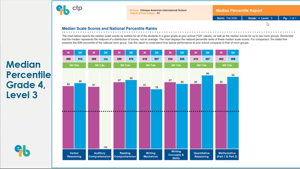 A perennial point of curiosity among prospective parents—which can sometimes even linger for current parents—is whether Mandarin immersion comes at the expense of achievement in English. The great news from research—and from generations of CAIS students’ experiences—is that learning is not a zero sum game. In fact, learning in each language builds connections and pathways that support learning in the other. We see this borne out in a variety of ways with CAIS students; one data point that provides helpful perspective in the context of peer school comparison is the results from annual ERB tests of 4th-7th graders. These standardized tests gather information on students’ English verbal reasoning, reading comprehension, writing mechanics, and writing concepts and skills, as well as their quantitative reasoning and mathematics.