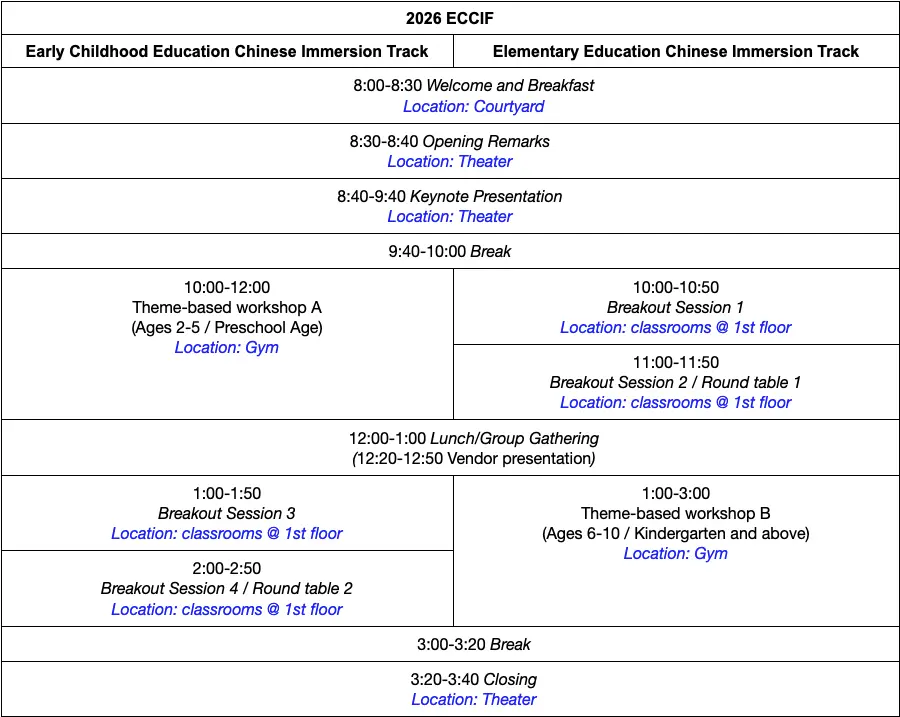 - Round tables: A collaborative discussion format centered on topics related to Chinese immersion and inclusive early childhood and elementary education. These sessions provide an open, informal space for participants to share insights, exchange experiences, and discuss challenges and strategies in a supportive setting.